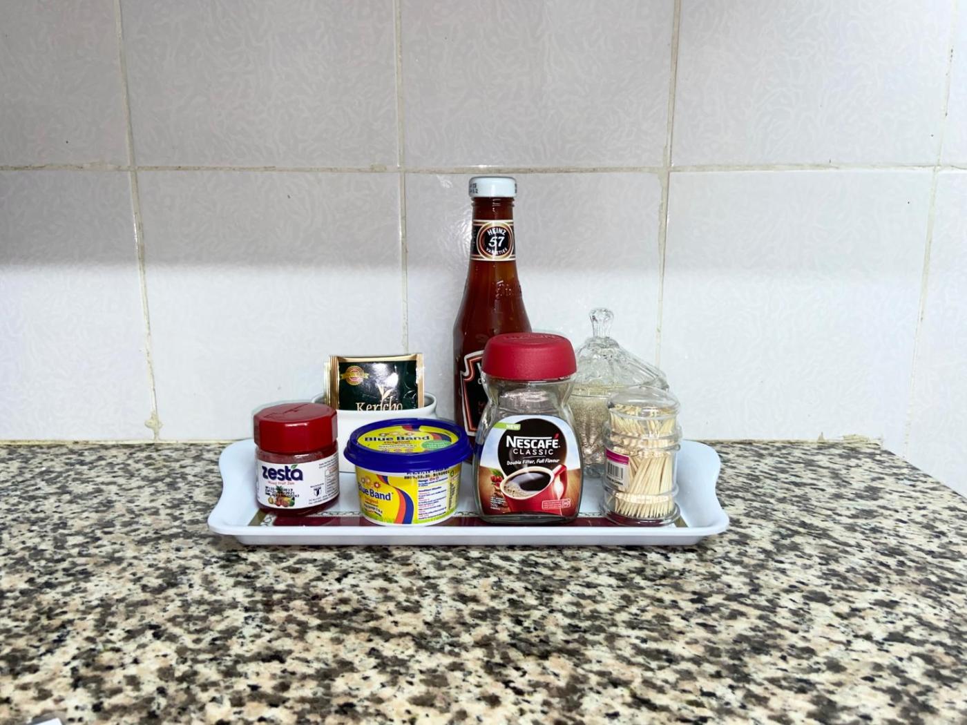 Shared stationery such as printed menus, magazines, pens, and paper removed